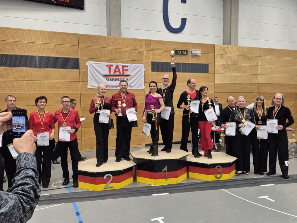 Am 15.11.2025 fanden in Duisburg die Deutschen Meisterschaften im Discofox (TAF) statt. Roland und Renate haben sich im Finale der Erw. 3 A-Klasse durchgesetzt und den Sieg ertanzt. Damit sind die beiden sowohl regulär nach Punkten und Plazierungen als auch als Sieger der Deutschen Meisterschaft sowie Erste der Rangliste in die S-Klasse aufgestiegen.
